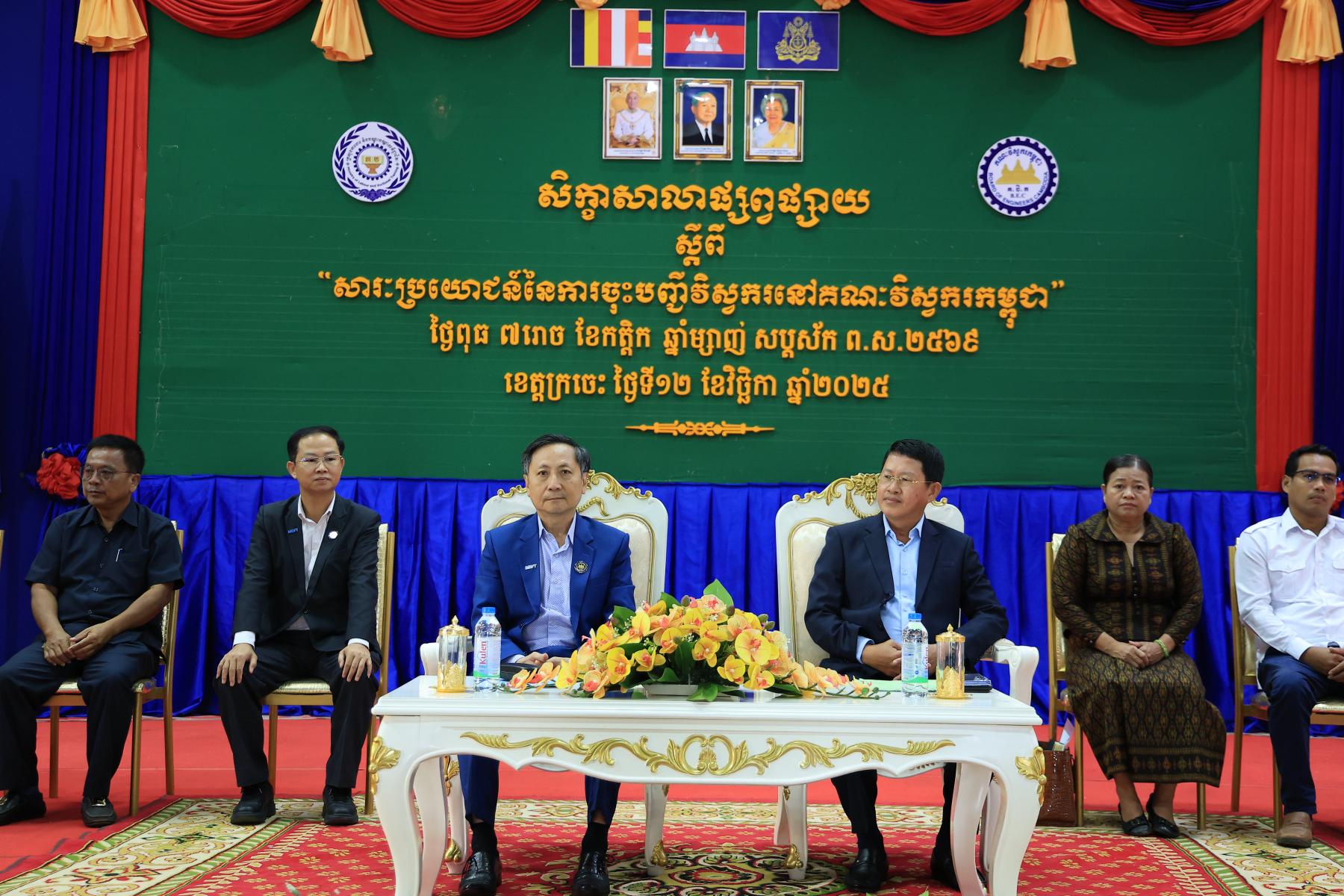 នាថ្ងៃពុធ ៧រោច ខែកត្តិក ឆ្នាំម្សាញ់ ព.ស.២៥៦៩ ត្រូវនឹងថ្ងៃទី១២ ខែវិច្ឆិកា ឆ្នាំ២០២៥ អគ្គលេខាធិការដ្ឋានគណៈវិស្វករកម្ពុជា បានរៀបចំសិក្ខាសិលាផ្សព្វផ្សាយស្តីពី "សារៈប្រយោជន៍នៃការចុះបញ្ជីវិស្វករនៅគណៈវិស្វករកម្ពុជា និងបទដ្ឋានគតិយុត្ត" ក្រោមអធិបតីភាព ឯកឧត្តម សុខុម រិទ្ធីវុធ អគ្គលេខាធិការគណៈវិស្វករកម្ពុជា និងលោក ហេង សុថា អភិបាលរង តំណាងដ៏ខ្ពង់ខ្ពស់របស់ ឯកឧត្តម វ៉ា ថន អភិបាលនៃគណៈអភិបាលខេត្តក្រចេះ ដែលមានការចូលរួមពីសំណាក់ ឯកឧត្តមអគ្គលេខាធិការរង និងថ្នាក់ដឹកនាំ នៃអគ្គលេខាធិការដ្ឋានគណៈវិស្វករកម្ពុជា លោក លោកស្រី អ្នកនាងកញ្ញា វិស្វករតាមបណ្តាមន្ទីរ អង្គភាព ក្រុមហ៊ុន ជុំវិញរដ្ឋបាលខេត្តក្រចេះ និងនិស្សិតផ្នែកវិស្វកម្មសរុបចំនួន ៣៧០នាក់ ស្រី ១៣៥នាក់។ សិក្ខាសាលាផ្សព្វផ្សាយនេះ តែងតែរៀបចំឡើងតាមបណ្តាខេត្ត-ក្រុងនានាក្នុងគោលបំណងដើម្បីបញ្ជ្រាបការយល់ដឹងអំពីសារៈប្រយោជន៍នៃការចុះបញ្ជីវិស្វករនៅគណៈវិស្វករកម្ពុជា និងលិខិតបទដ្ឋានគតិយុត្តនានាពាក់ព័ន្ធនឹងវិស័យវិស្វកម្ម ដល់និស្សិតផ្នែកវិស្វកម្ម និងវិស្វករ ដែលមានបំណងប្រកប ឬកំពុងប្រកបវិជ្ជាជីវៈវិស្វកម្មក្នុងព្រះរាជាណាចក្រកម្ពុជា។